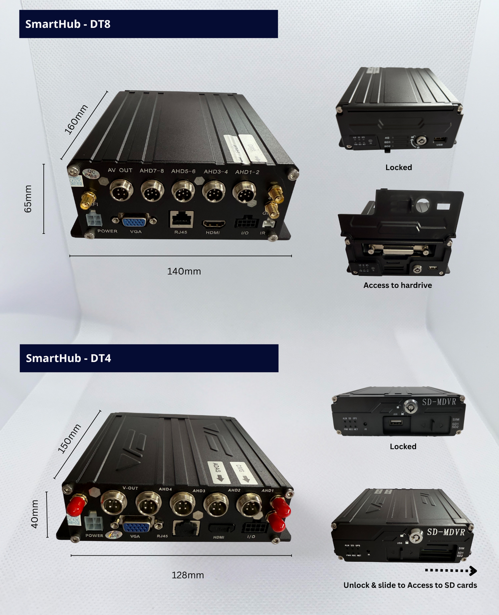 SmartHubs can accept up to 4, 8 or 16 cameras and are a centralised controller of a multi camera vehicle system. It's a flexible and cost effective combination of a high definition display + cameras that record and store +long period/large storage capacity + 4G remote connectivity + vehicle management software + reversing camera function + WIFI + GPS + driver alert speaker.